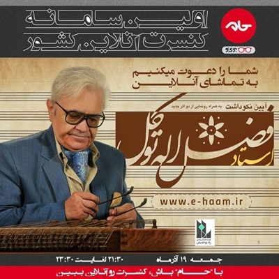 علاقمندان میتوانند از طریق سامانه کنسرت آنلاین کشور (حام) به آدرس اینترنتی www.e-haam.ir این مراسم را در روز جمعه 19 آذر 1395 ساعت 21:30 مشاهده بفرمایند.